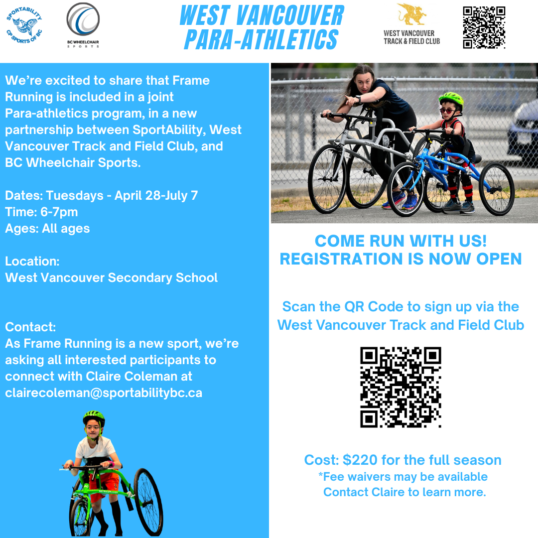 SportAbility is excited to be launching our first Frame Running program in partnership with the West Vancouver Track and Field Club in the Spring of 2026. Interested in being a part of this exciting new sport? Contact us today!